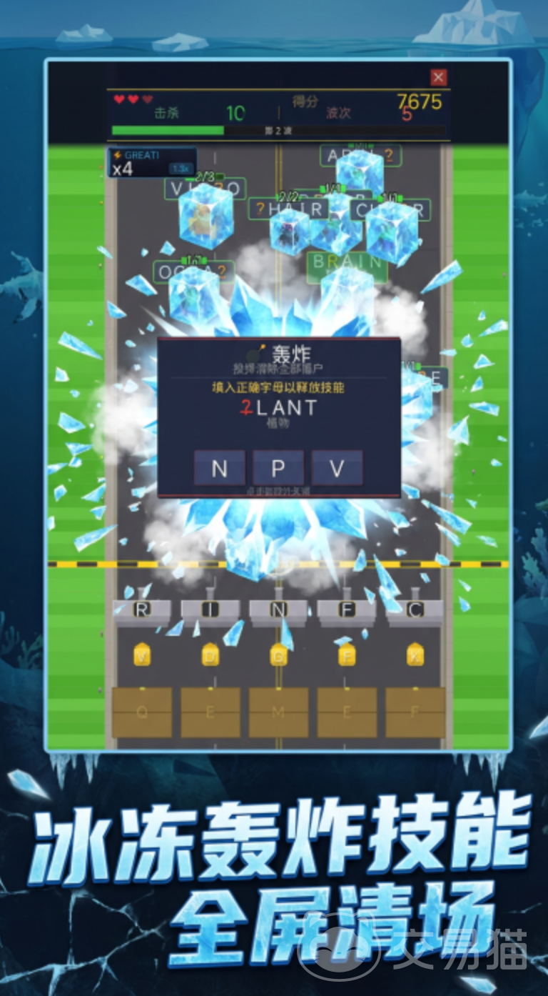 技能体系设计注重策略性与操作反馈:冰冻技能可显著降低僵尸移动速度,轰炸技能则能对范围内多个目标施加击退与伤害效果。随着关卡推进,僵尸种类持续增加,行为模式愈发复杂,要求玩家在高压节奏中保持逻辑清晰,快速识别残缺单词,并合理搭配技能与道具资源,方能高效通关。