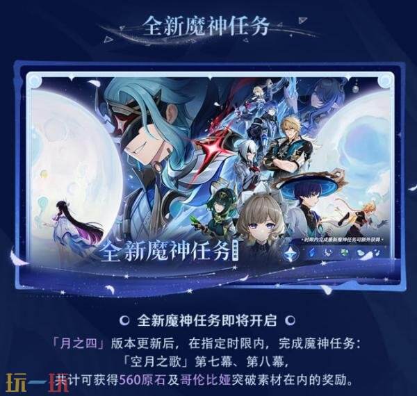 原神「月之四」版本「『空月之歌·终曲』如果在冬夜,一个旅人」于2026年1月14日更新后正式开启,全新角色「空月归乡·哥伦比娅(水)」(5)、「驹隙隐泉·兹白(岩)」(5)、「魇夜燃芯·叶洛亚(岩)」(4)正式上线。