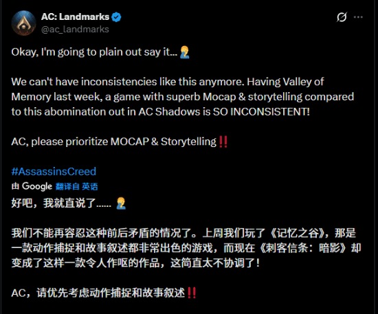 与此同时还有玩家对《进击的巨人》的联动表示不满:“完全是在浪费时间。整个联动任务中几乎90%的内容都是非常普通的攀爬和摆荡,路线设计也很糟糕。”还有玩家指出:““我们不能再接受这种不一致了。记忆之谷上周发布,其动作捕捉和叙事水准都很棒,而《AC影》这次的扩展简直是灾难,完全不一致。”