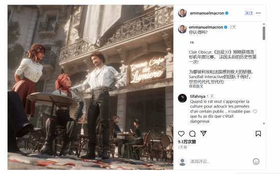 在《光与影:33号远征队》(Clair Obscur: Expedition 33)在 TGA 2025(The Game Awards)颁奖典礼上创纪录地斩获九项大奖后,法国总统埃马纽埃尔·马克龙(Emmanuel Macron)在社交媒体上公开向这款法国开发的游戏致以祝贺,这也是他第二次为该作“点赞”。