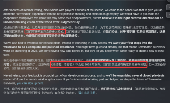 最近的一条《终结者:幸存者》Steam社区官方帖子中,Nacon Studio Milan确认《终结者:幸存者》将会延期:不会在2025年发售,而具体的发售日期目前尚未确定。