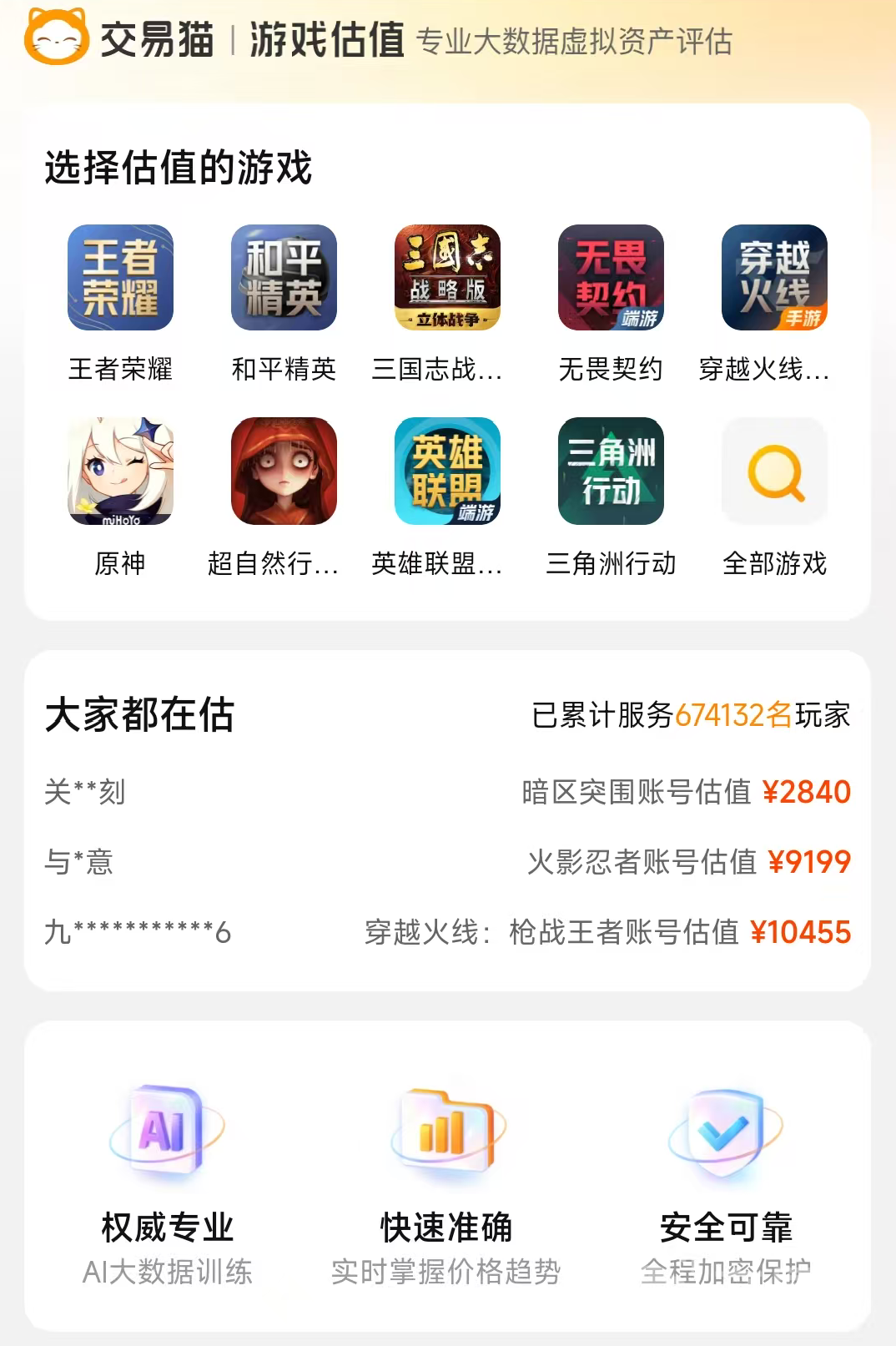 扫码下载APP 下载 点击下载APP很多玩家在购买帐号之前都会核对账号内的各类有价值的道具,毕竟一旦出现问题的话,后续追回会非常麻烦,而平台就不需要担忧这样的问题,因为平台内的多个账号都经过了全面的检测,能确保账号内的内容是真实存在的,而且会附上对应的截图,同时为了保证安全,会提供完整的安心购服务,一旦后续出现任何问题官方都会第一时间处理以及赔付,严选各种优质的商品,官方验号服务覆盖超百款热门游戏,验号信息真实、完整有特别地精准,想要使用app的话,安卓用户点击上方按钮即可下载使用,iOS用户直接访问官网就能体验平台服务。
