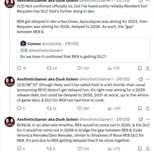 他表示,《生化危机9》的DLC比预期地开发进度更快,这是因为《生化危机9》的开发曾多次延期,《生化危机:启示录》原定于2023年发售,《生化危机9:安魂曲》原定于2025年,后延期至2026年。