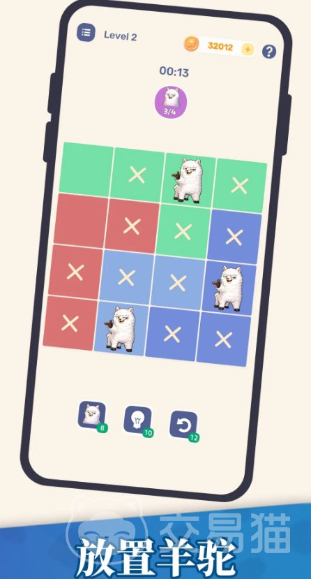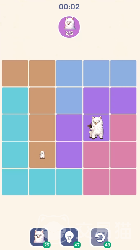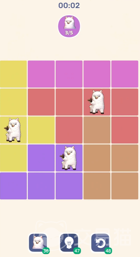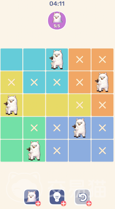 游戏采用网格化棋盘设计,格子按颜色分区,每行、每列及每种颜色区域内均限放置一只羊驼;同时,所有羊驼之间不可相邻——包括上下、左右及四个对角方向。在严格约束下,玩家需通过排除法、唯一性判断等逻辑手段,推导出每个羊驼的精确落点,成功通关后将获得清晰而强烈的成就感。