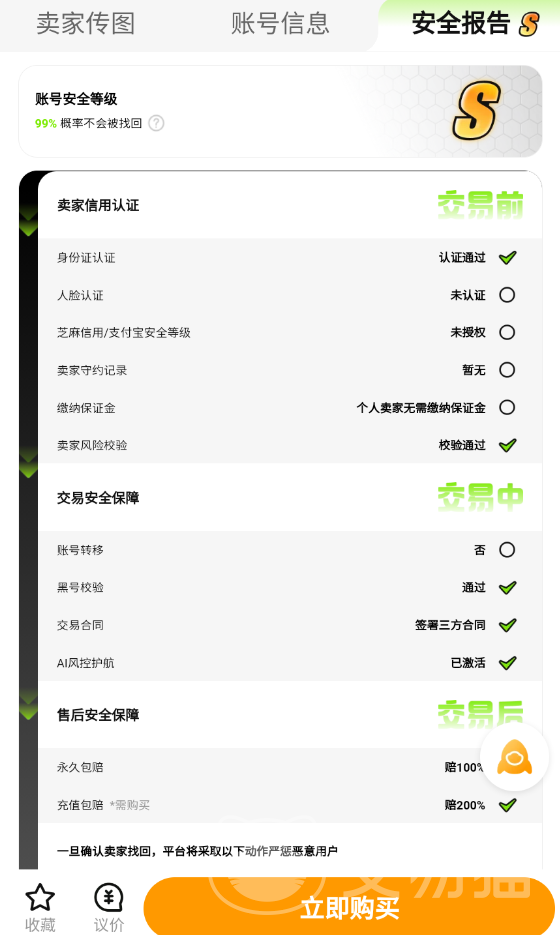 安全就是的核心底色,也是它的硬核优势。有独特的官方托管和担保机制,给大家构建一个相对安全的交易环境。当你委托官方托管以后,交易员会帮你上号验证,截图采集信息,而买家下单以后也无需验号,由交易员帮助换绑邮箱和实名等。还可以查看该商品的安全报告评分,选购高评分的号。