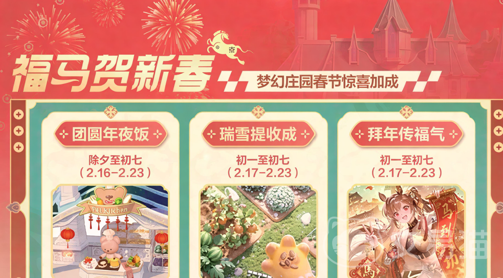 版本上线后,游戏主界面将同步更换为全新冬日雪景主题背景。该主题包含多组动态雪景场景,画面细腻、氛围清冽,支持玩家通过商城购买获取。紧随其后的是除夕限定“梦幻烟花秀”活动——仅在农历除夕当日开启,届时梦幻庄园上空将呈现持续数分钟的全景动态焰火表演,虽不提供道具奖励,但强沉浸感的视听效果显著提升节日仪式感。