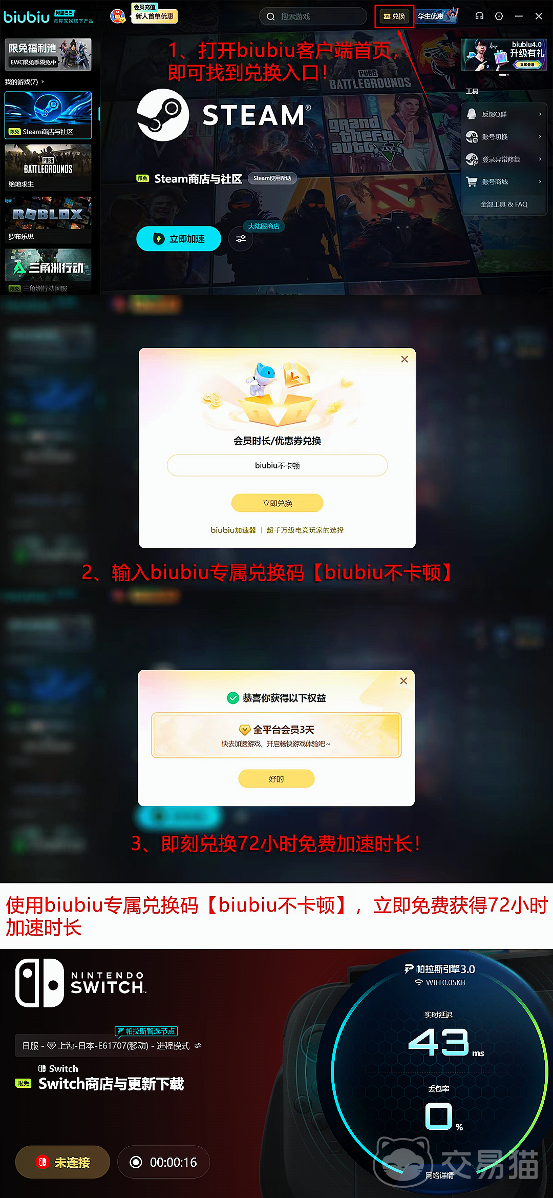 新用户完成注册后可立即启用24小时全游戏免费加速服务;输入通用兑换码【biubiu不卡顿】可额外获得3天加速权益;首登用户还可叠加96小时专属加速时长,全程零费用体验高帧率、低延迟的稳定联机环境。以上福利无需订阅付费,所有加速节点均通过阿里云全球骨干网直连部署,保障跨区域对战数据传输质量。