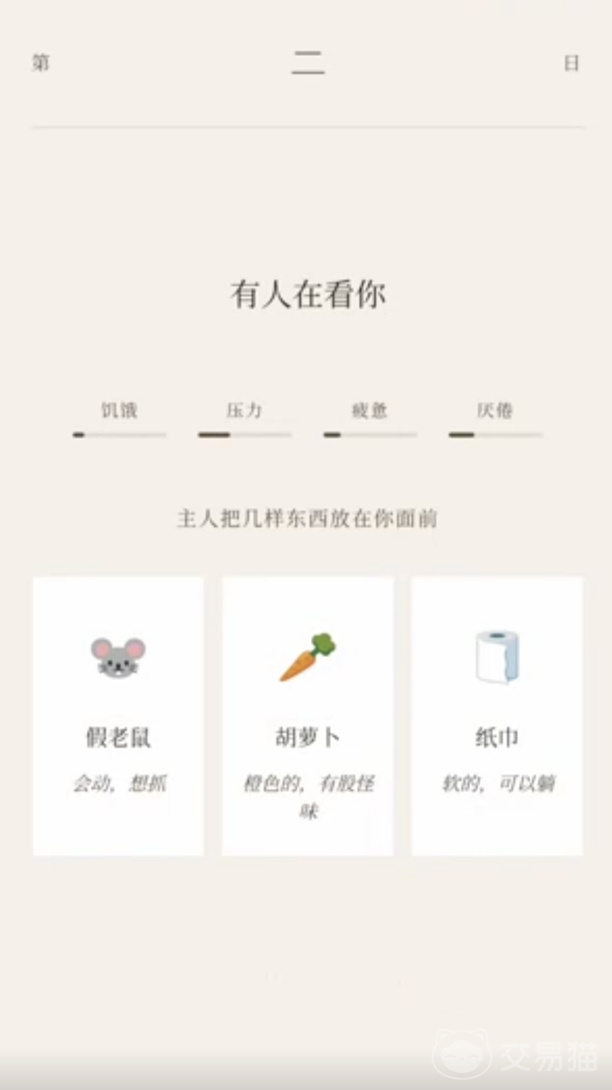 游戏内共设计十七种独立结局,每一种均需满足特定数值条件与行为路径。例如“反抗结局”要求饥饿值≥100,且在连续六轮中完全不选取任何萝卜类物品,同时拒绝使用小鱼干缓解饥饿状态,并坚持整整十天——即以系统性绝食方式达成与主人意志的对抗,方可解锁该分支。