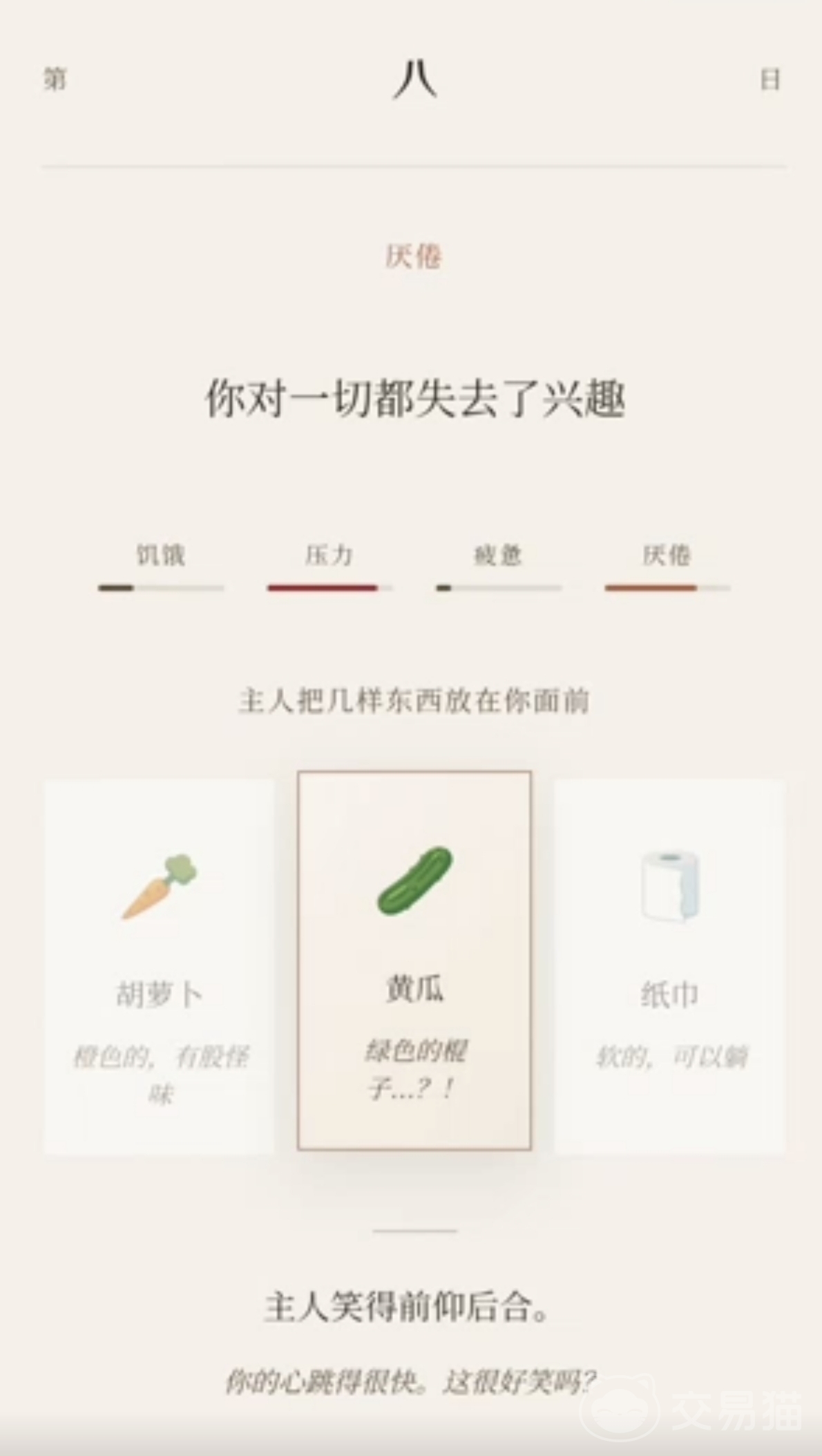 而“摆烂结局”的触发条件为厌倦值≥100,玩家需持续重复选择萝卜类物品以获取主人表扬,每次选择萝卜将使疲惫值 8,表扬反馈亦同步 8,导致厌倦值加速累积;通常在第10至12回合间即可达成该结局条件。