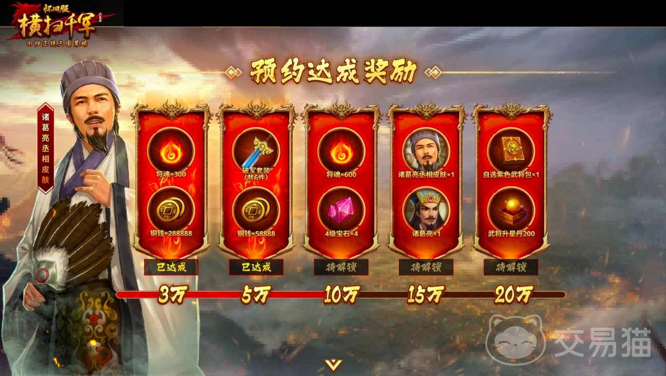 预约进度奖励采用阶梯式发放机制:达成3万人预约,全服发放300将魂、288888铜钱;预约人数达5万时,追加破军6件套与58888铜钱;突破10万预约门槛后,参与预约玩家可领取600将魂及4枚4级宝石;预约量达15万,解锁诸葛亮英雄角色及诸葛亮丞相专属皮肤;当预约总数达到20万,将开放自选紫色武将礼包×1、武将升星丹×200。奖池持续累加,激励玩家共同推动版本热度升级。