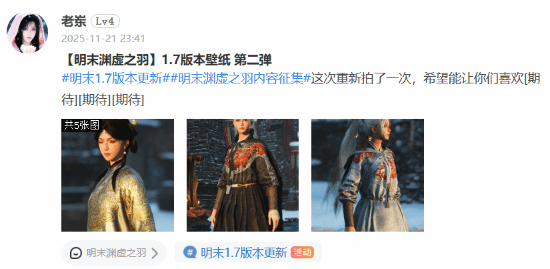 近日,《明末:渊虚之羽》1.7版本更新上线,本次补丁大小为1.6GB。同时新增了3套全新风格防具、2把武器以及专属头饰等。