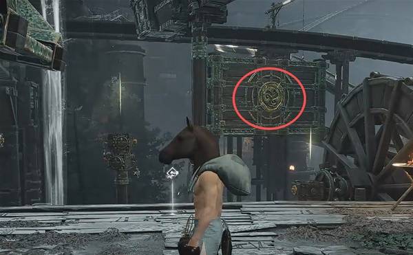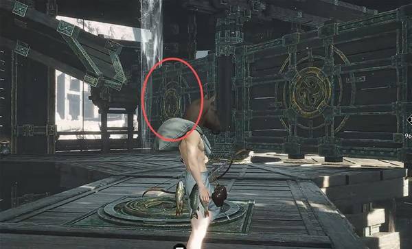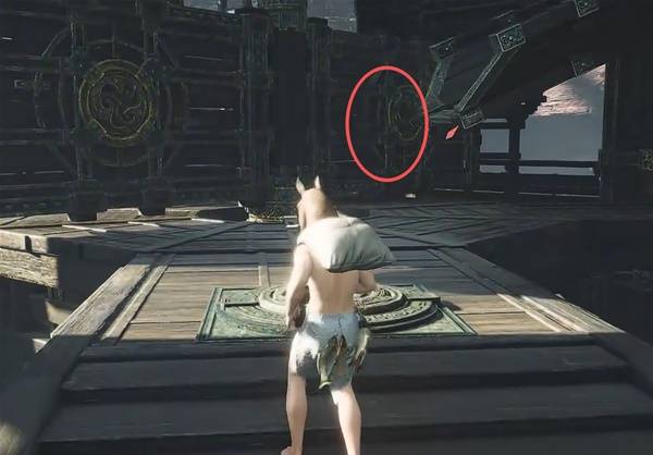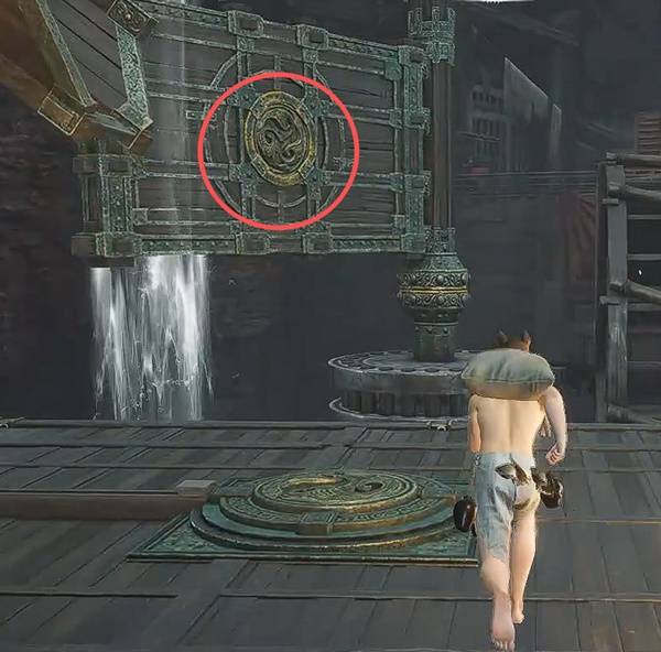 走水车右侧的路绕回到刚刚的屋子,会发现另一个【发光地板机关】,然后使用【太极】把石头扔到左侧的【木板机关】上。回去处理水车的链接即可。