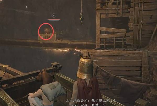 水车开始动了了之后,把下图左侧圆圈的绳索,放到右边,然后就会有一个【可乘坐木板】过来;站到木板上,把刚刚的绳索放回去,就可以到对面了。