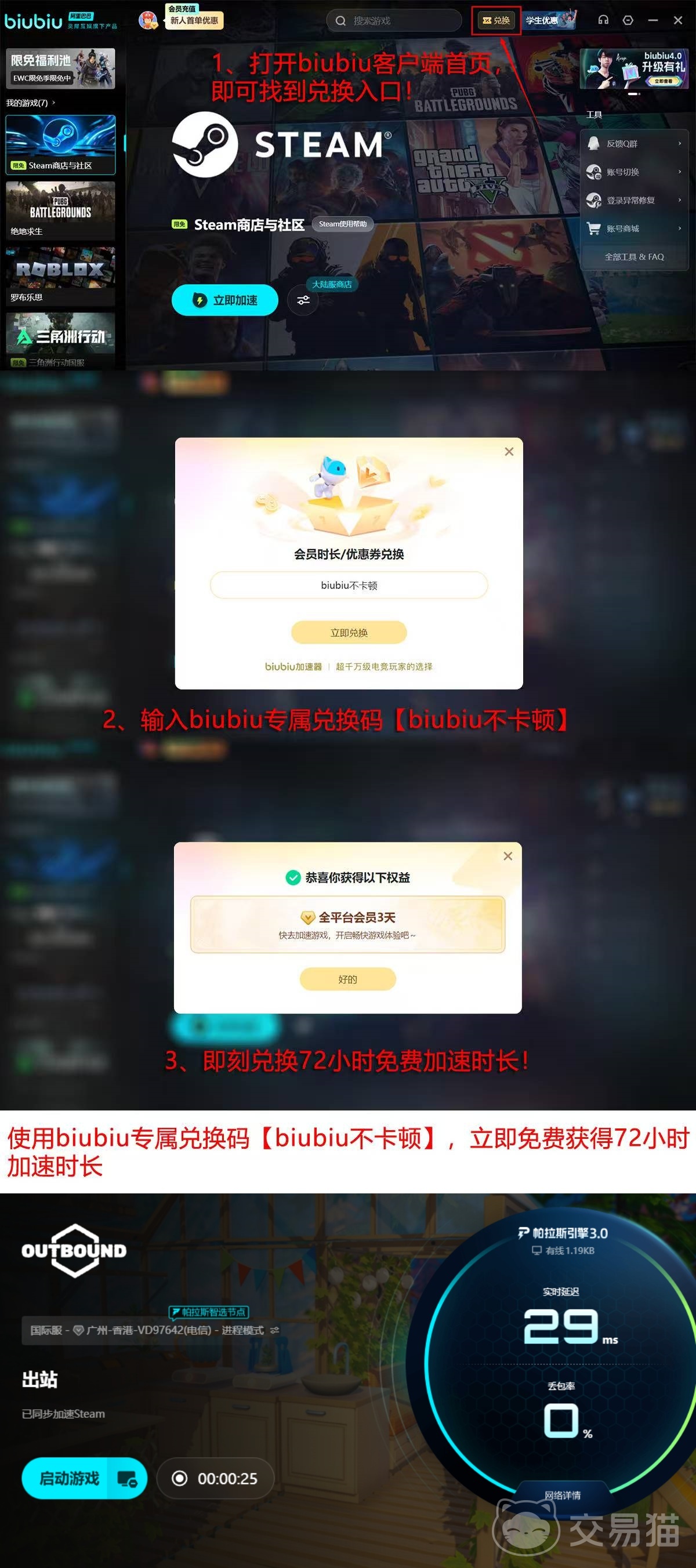 针对新用户,biubiu加速器提供基础福利:首次启动即赠送24小时免费加速时长;输入兑换码【biubiu不卡顿】还可额外获得3天加速服务。