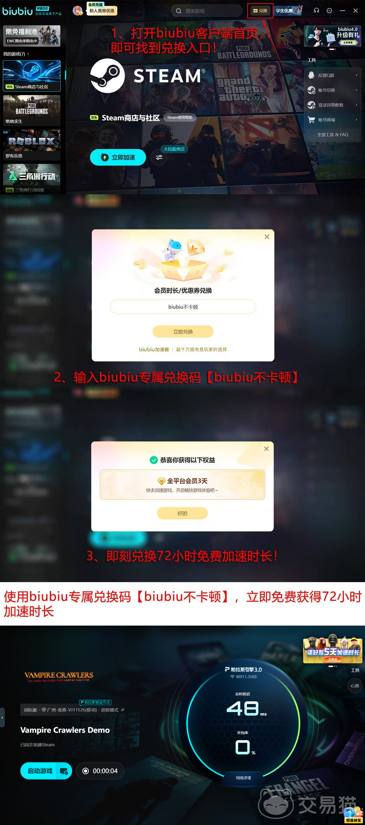 新用户注册后将自动获赠24小时全功能免费试用权限;输入激活码【biubiu不卡顿】,还可额外领取72小时高级加速服务。两项权益叠加,新用户可连续享受总计96小时的无限制性能优化支持。