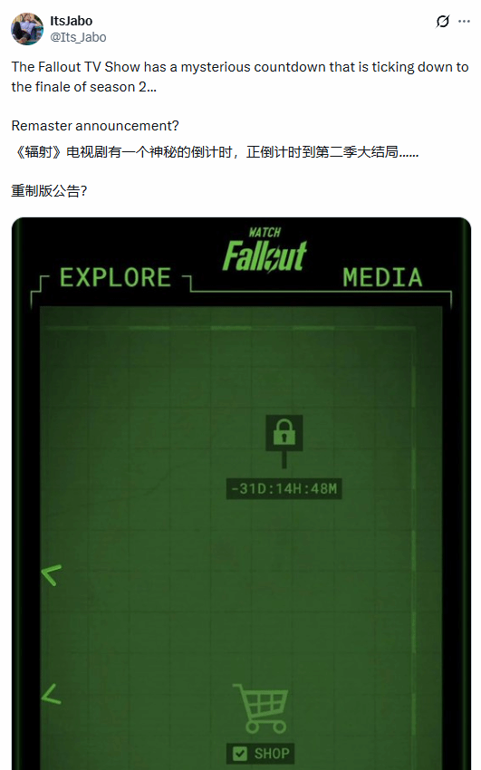 1月4日,随着《辐射》真人剧第二季大结局降至,玩家发现了亚马逊 Prime Video 网站上出现了神秘倒计时,也许这意味着《辐射》又将有新的动向。