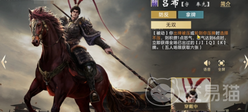 吕布拥有独特的防反体系与怒气成长机制。当怒气值累积至6点后,可从已获取的卡牌中指定抽取一张Q或K级卡牌,强化关键节点的爆发能力。该设计使其在持久战中越战越强,尤其适配需要多轮博弈的中慢速对局。