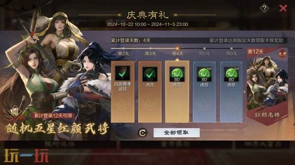 庆典活动期间登录的角色,将激活持续15天的庆典有礼登录奖励,每日登录即可领取共计800虎符,更有自选赛季武将和免费5星红颜名将恭候玩家大驾!