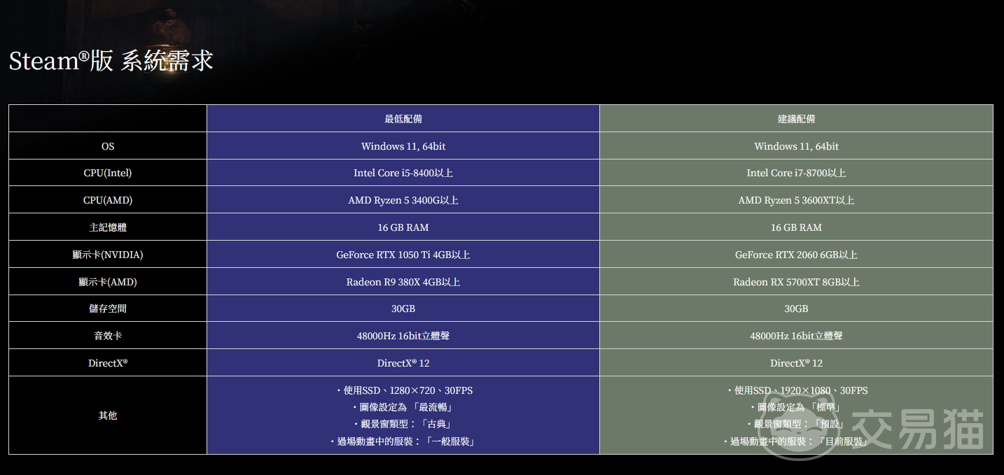 从整体定位来看,《零~红蝶~重制版》延续了系列对硬件要求相对友好的传统。只要满足最低配置,即可保障基础流程的稳定运行。操作系统需为Windows 11 64位;处理器方面,Intel Core i5-8400或AMD Ryzen 5 3400G及以上型号均可胜任;内存容量不得低于16GB;显卡方面,NVIDIA GeForce GTX 1050 Ti(4GB)或AMD Radeon R9 380X(4GB)为入门门槛;存储空间需预留至少30GB可用容量,且强烈建议使用固态硬盘(SSD),以规避地图加载延迟或过场动画卡顿等问题;此外,DirectX版本必须为12.0或更高。
