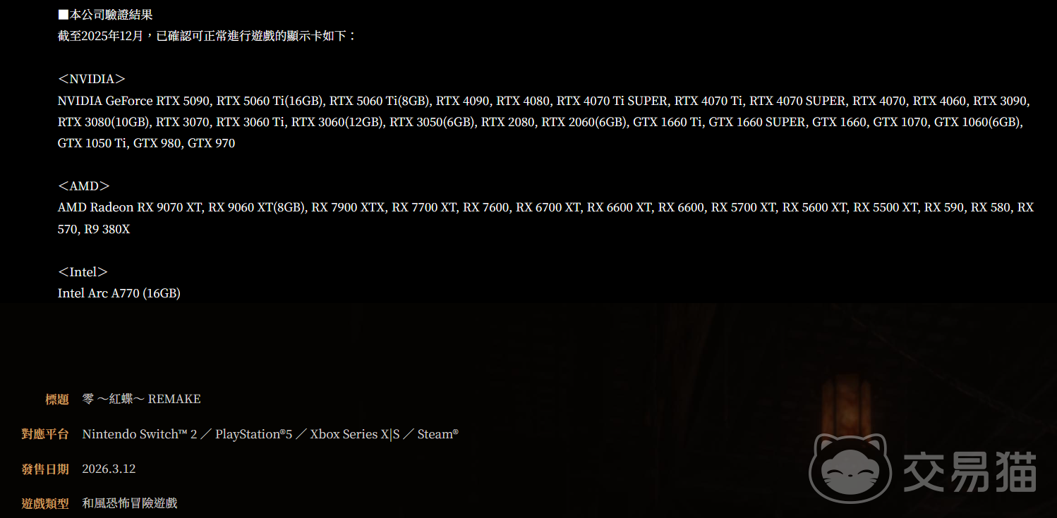 关注恐怖解谜类游戏动态的玩家近期一定留意到了《零~红蝶~重制版》的正式官宣消息。作为“零”系列中极具代表性的作品,本作不仅承载着大量玩家的童年回忆,更凭借其独特的日式民俗恐怖氛围与沉浸式叙事广受好评。据悉,该重制版将于2026年3月12日同步登陆PC平台,并覆盖Nintendo Switch 2、Xbox Series X|S及PlayStation 5等主流主机平台。本文将依据官方公布的硬件参数,系统梳理PC端运行所需的配置标准,帮助玩家提前评估设备兼容性。