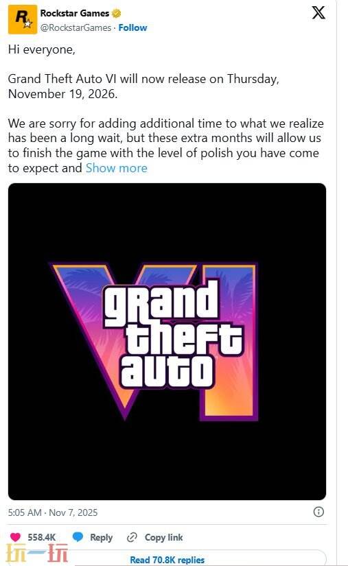 官方声明解释了推迟原因,表示需要“额外几个月的时间”来确保游戏质量。Rockstar 称:“很抱歉让大家在漫长的等待中又多花了时间。这额外的几个月将让我们能以大家期待和应得的水平完成游戏。”
