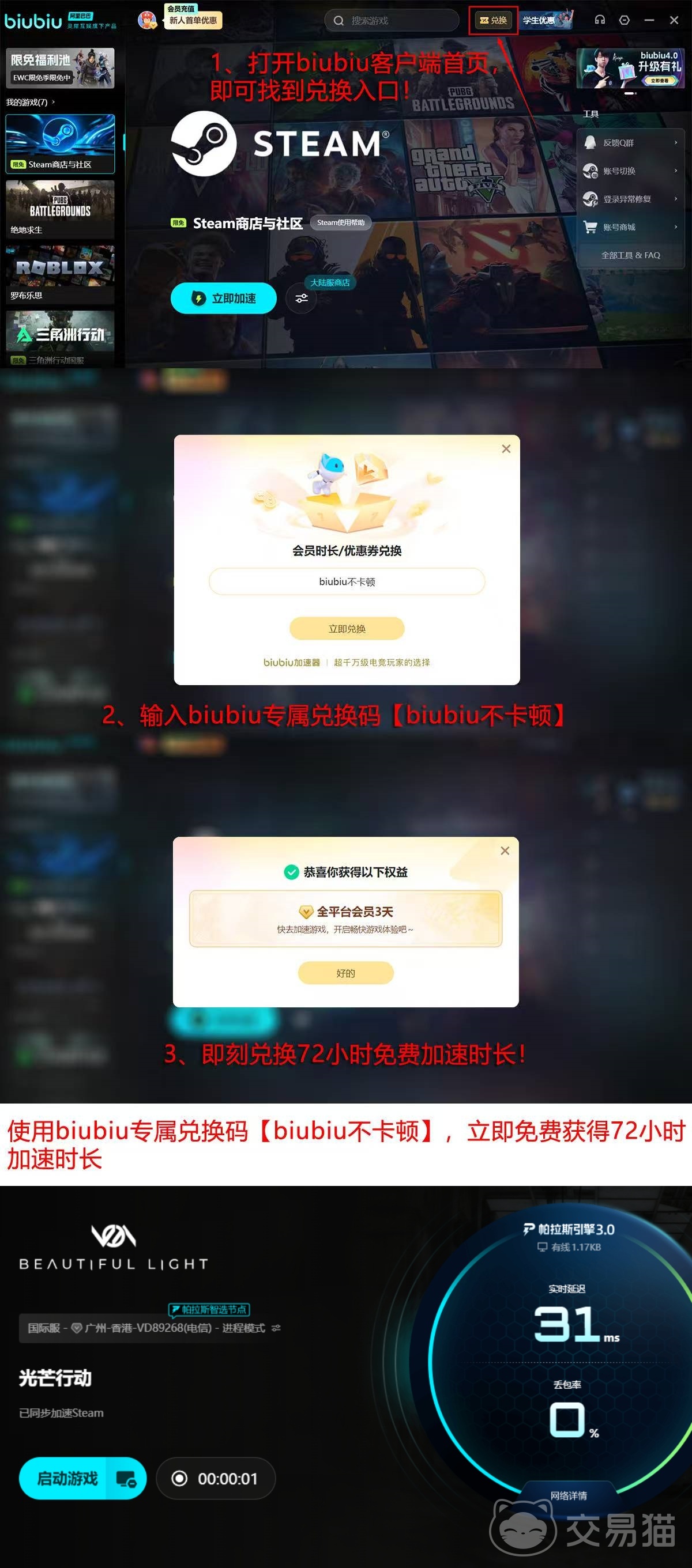 新用户首次启动biubiu加速器即可获赠24小时全功能免费使用权限。输入兑换码【biubiu不卡顿】,还可额外领取3天加速时长,无需绑定支付方式即可立即启用。