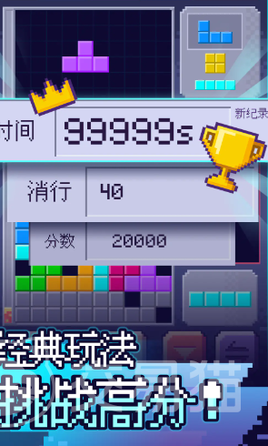 单人体验同样经过精细化分层设计:经典模式严格复刻原始方块物理逻辑与得分机制,还原纯粹消除快感;竞速模式限定时间窗口,考验单位时间内最大消除行数与连击稳定性;生存模式则通过阶梯式加速下落节奏,持续施加操作压力,检验玩家在高压环境下的决策精度。视觉层面采用低饱和度像素美术风格,兼顾辨识度与长时间游玩的视觉舒适性;操作层开放自定义按键映射功能,支持左右手布局切换、触控灵敏度调节等个性化设置,显著提升操作一致性与响应精准度。