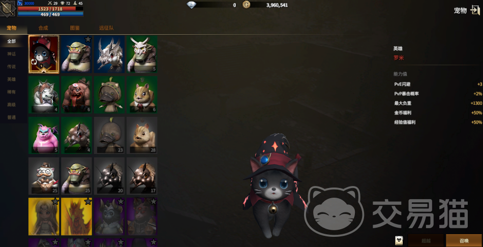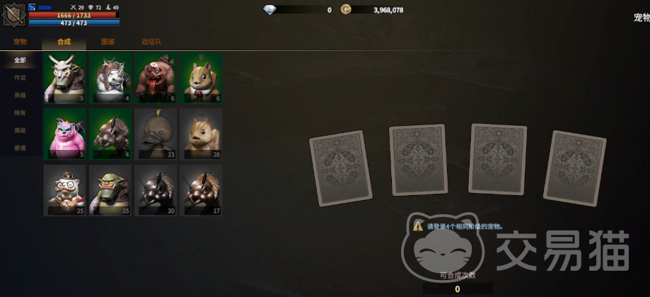 宠物按稀有度划分为蓝、红、紫、金四档,对应基础、进阶、精英与传说品质。属性加成随品质跃升呈阶梯式增长。品质突破依赖合成机制:4只蓝色宠物可合成1只红色;4只红色合成1只紫色;而2只紫色即可合成1只金色宠物。该数值规则固定,不可变更。