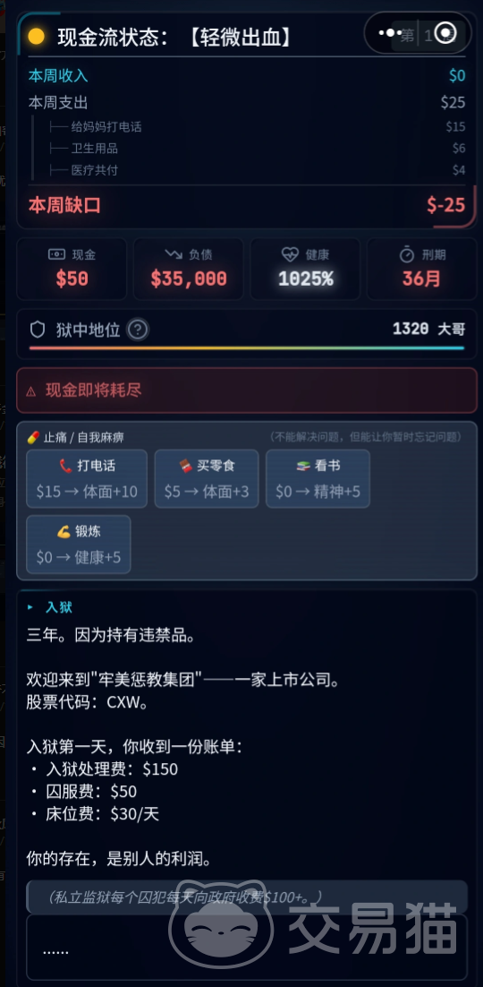 以私立监狱囚犯为例,其健康值处于高位区间,但现金与负债数值明显失衡,极易触发“斩杀线”。操作过程中需重点监控“现金”与“健康”双状态栏——当任一指标滑落至临界值以下,须立即启动修复动作。同时,“狱中地位”为隐性核心变量:它既直接影响日常生存质量,也决定三年刑期结束后能否有效填补现金流缺口。值得注意的是,私立监狱本身即构成一项持续性费用支出,玩家必须精确测算储蓄余额是否足以支撑至释放节点。