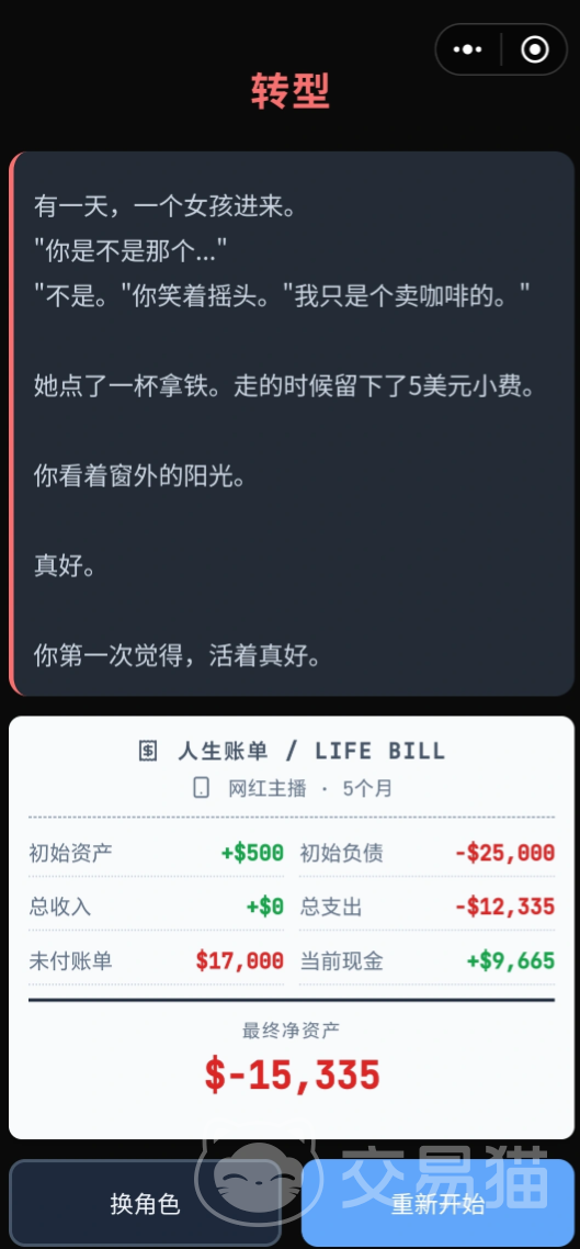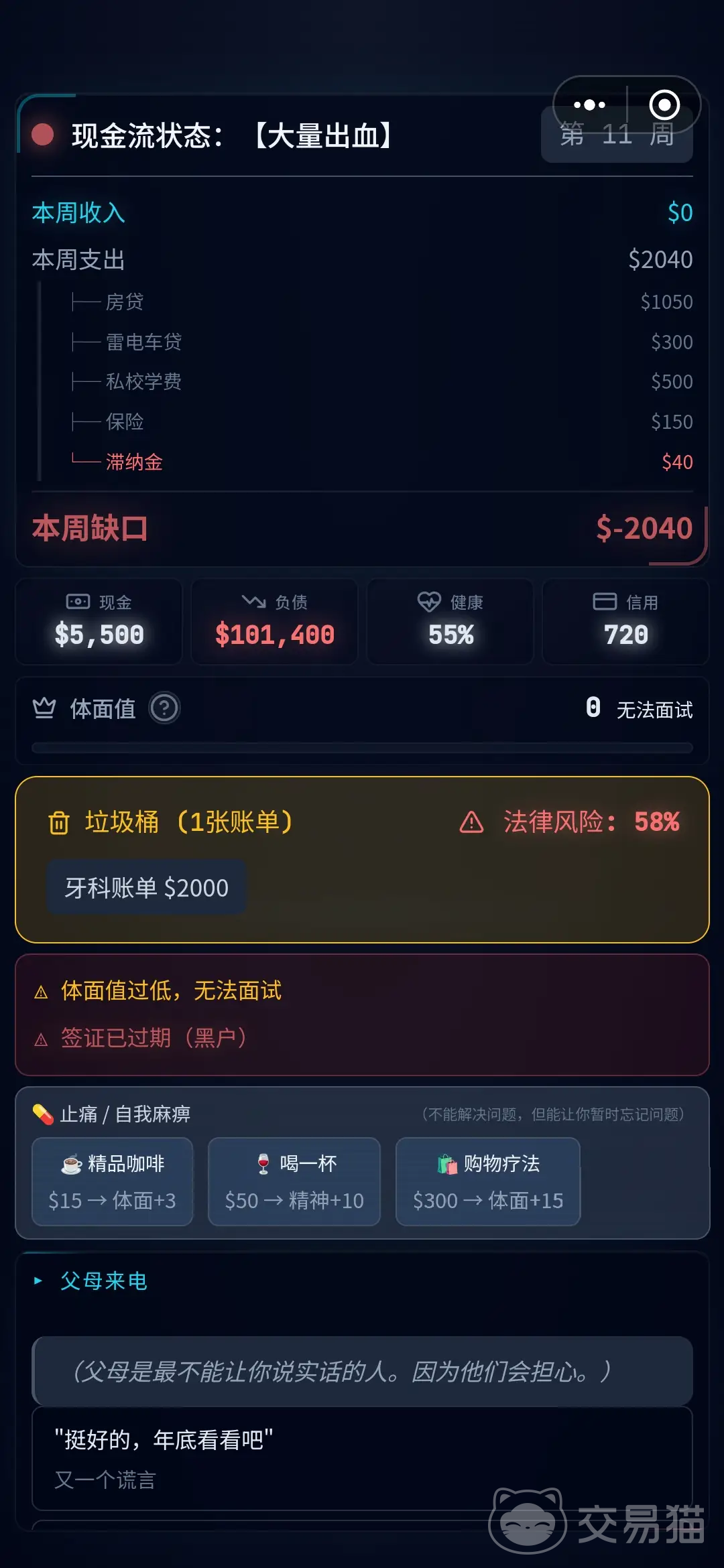 除物质层面压力外,房贷、车贷及医疗账单等刚性支出将持续压缩财务弹性空间,并引发连锁性的精神负荷。每位角色均设有独立的精神耐受阈值,一旦突破即触发“精神斩杀线”,导致不可逆的游戏终结。此时决策重心需转向风险可控路径。痛觉反馈机制贯穿全程,持续恶化将显著削弱角色体面度。玩家最终目标是在严重失衡的现金流中重建正向循环——是自社交名流跌落为街头流浪者,还是从底层起点稳步崛起成为区域影响力人物?答案取决于每一回合的理性判断与资源取舍。