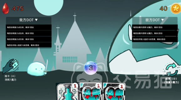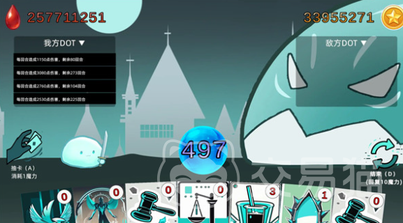 本作采用严谨的回合制结构,每一轮行动都需统筹法力分配、卡组调度与状态管理。玩家必须在有限资源下完成三重目标:一是稳定施加中毒、灼烧、腐蚀等不同属性的DOT效果;二是通过连锁反应延长持续时间并提升总伤;三是规避BOSS高频反制带来的生存风险。卡牌之间存在明确的协同逻辑——例如某张技能卡可使下一张DOT卡伤害提升30%,另一张则能重置已存在DOT的剩余回合数。这种设计将战斗升华为一场关于节奏控制与变量预判的深度博弈。