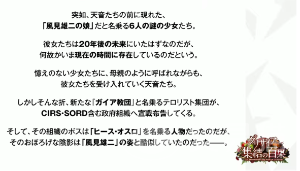 本作故事设定于时间裂隙之中:六位自称“风见雄二之女”的少女自20年后的未来穿越至当下,突兀现身于周防天音等人面前。尽管主角团对她们毫无过往记忆,仍选择接纳这群身份成谜的访客。与此同时,“盖亚教团”这一极端组织向国家安全部门发起公开挑战,其领袖外貌与风见雄二高度一致,由此牵扯出横跨时空的身份悖论、记忆篡改与代际羁绊等深层命题。