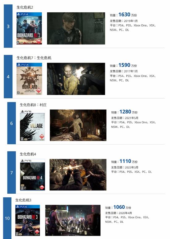 除了《怪猎》系列,“白金游戏列表”前10名的剩余位置几乎被《生化危机》系列霸占,其中《生化危机2:重制版》排名第3(1630万份)、《生化危机7》排名第4(1590万份)、《生化危机8》排名第6(1280万份)、《生化危机4:重制版》排名第7(1110万份)、《生化危机3:重制版》位居第10(1060万份)。