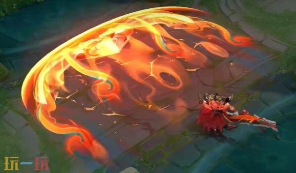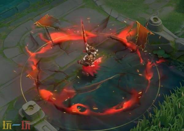 一技能:肩甲瑞兽骤然苏醒,迸发为火焰般的巨大能量体,裹挟着烈火发起冲锋。而后刀锋悍然上挑,地面应声崩裂,地刺与古老旌旗破土而出。