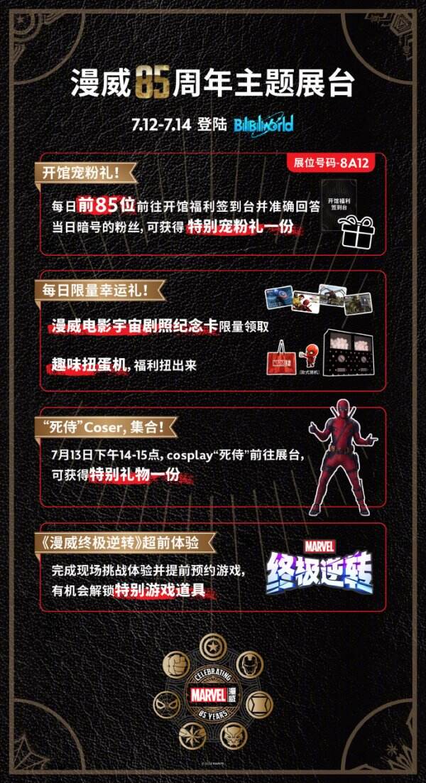 7月12日-7月14日,一系列专属漫威迷们的重磅惊喜在BW2024等你。每天前85位粉丝有机会领取宠粉福利、每天限量幸运礼随时掉落、指定时间内cosplay“死侍”还有特别惊喜~、打卡《漫威终极逆转》超前体验更有机会解锁特别道具!