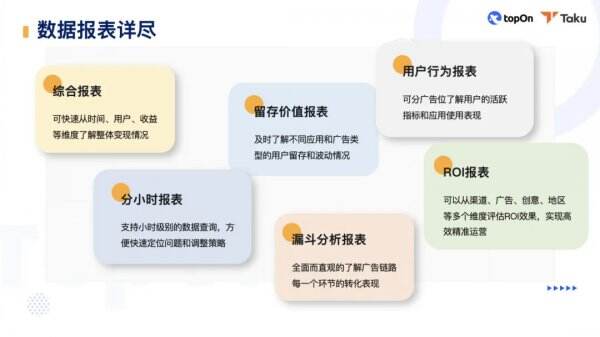 TopOn&Taku是为全球移动应用开发者提升广告变现收益的聚合变现工具平台,TopOn聚合海外平台,Taku聚合中国平台,开发者可通过TopOn&Taku的SDK对接全球50 广告平台,实现全球流量一站式管理,最大化每一次广告展示收益,比单一接入广告平台,变现收益至少提升20%。
