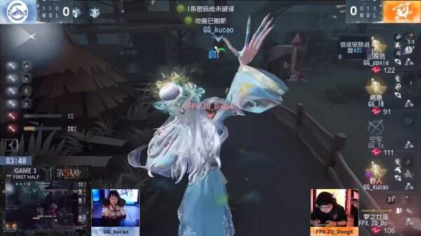 第一天FPX.ZQvs 成都GG第三局上半局,FPX.ZQ_DongX女巫卷土重来,四抓翻盘拿下胜利:开局FPX.ZQ_DongX虽然信徒双包快速拿到病患一刀,但是为了超距丢失视野被迫再起节奏,局势不利。开局一分钟时假意追击勘探员实则偷袭正在修机的野人,开出技能后追击野人,放狗不让其上猪,被快速击倒挂上。空军救人消耗枪后,FPX.ZQ_DongX顺势换挂,通缉到全场唯一满血的勘探员,在远处被信徒拦截无法救人,局势出现转变。FPX.ZQ_DongX一边拦住勘探员,一边追击野人,空军淘汰,给到勘探员一刀,全场残状态。FPX.ZQ_DongX操纵女巫本体,细节卡距离不给蛇标在远处放狗,野人上猪被打断,快速续上节奏,求生者状态不好失去反制手段,FPX.ZQ_DongX逐一击破,拿下关键性四抓。