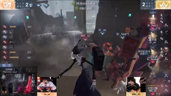 第一天MRC cs Gr第一局下半局,MRC_XC绝活时空之影控场四抓:开局MRC_XC排点找画家,求生者为了不被逃跑锁住密码机纷纷跑图,MRC_XC寄宿陶片封住小木屋区域,本体异族本相命中,高侵蚀度状态下拿到一刀,伊斯人再次异族本相,MRC_XC快速击倒画家,压住中场遗产机。守椅战中,本体异族本相命中佣兵,佣兵救人后双倒。画家放画控住本体,但是MRC_XC及时切伊斯人释放技能成功叠满侵蚀度,画家再次被击倒。MRC_XC强行将画家挂回遗产机,此时密码机进度仍不到三台。画家被二救后,MRC_XC在第二幅画画好前果断闪现击倒。MRC_XC落地直接叠满侵蚀度命中魔术师,全员残状态,时空之影进入优势控场,来回切换伊斯人,消耗求生者道具,佣兵护腕消耗完后被时空之影传送陶片落地击倒,无人能救人,密码机进度差一台。面对魔术师强救人,MRC_XC精准把控刀气,椅边反复出刀成功拦截,闪现击倒加速的拉拉队员,拿下四抓。