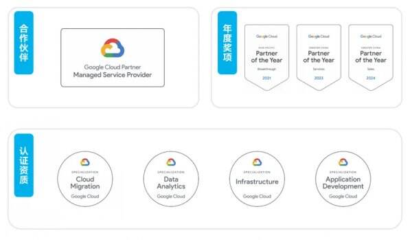 我们是中国大陆率先且唯一获得 Google Cloud Managed Service Provider(MSP)资质的合作伙伴,拥有多项专精领域认证,更是凭借在谷歌云解决方案和产品方面的广泛技术能力,连续斩获2021、2023及2024年度 Google Cloud 最佳合作伙伴奖项。