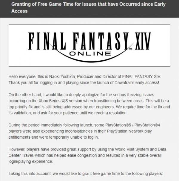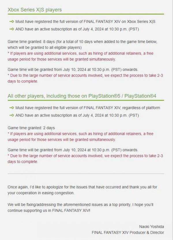 为了弥补玩家在此期间的不便,SE官方迅速响应,宣布了一系列补偿措施:所有Xbox版本的《最终幻想14》完整版玩家,自7月4日(太平洋标准时间)晚上10:30起,将额外获得8天的免费游戏时间,并同步赠送额外的服务时长作为补偿。对于非Xbox平台的玩家,只要他们拥有对应平台的《最终幻想14》完整版游戏,同样也能享受到为期2天的免费游戏时间,总计可达10天。