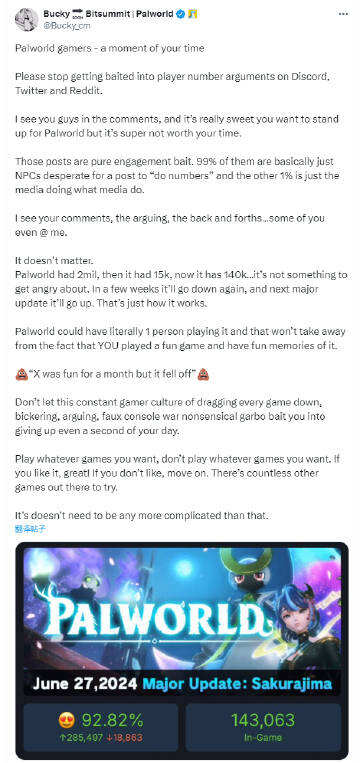 Bucky称:“请不要再在Discord、X和Redit上参与玩家数量的争论了。我看到了你们的评论、争论、来来回回……有些人甚至at我,这没啥的。《幻兽帕鲁》最初有200万玩家,后来有1.5万,现在又有14万……没什么好争论的。几周后它会再次下降,下一次重大更新时,它又会上升。这就是它的运作方式。即使它可能真的只有一个人在玩,但这并不会改变你玩过一款有趣的游戏并留下美好回忆的事实。”