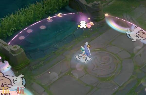 * 三技能:小乔头顶浮现出马尔济斯为她加油鼓劲~脚下展开绘有两只小狗的温馨绘图;随后,无数小礼物从空中纷纷落下,每一份都包裹着星光,宛如一场充满童趣的治愈之雨!