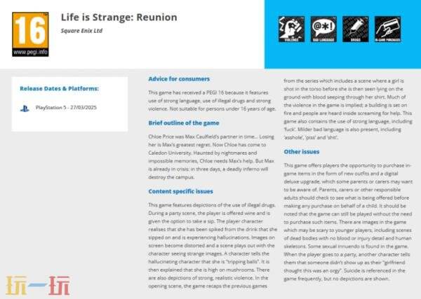 泛欧洲游戏信息网(Pan European Game Information)对尚未公布的《奇异人生:重聚》(Life is Strange: Reunion )进行了评级。根据评级日期来看,该评级似乎是在2025年3月发布的。本游戏被评为PEGI 16级,因为它包含粗俗语言、非法**和暴力内容。不适合16岁以下人士游玩。