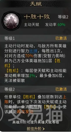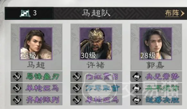阵容推荐采用“许褚 马超 郭嘉”铁三角组合:许褚担任绝对主C,马超作为副C兼功能型输出,郭嘉则承担节奏调控与概率强化中枢角色。马超不仅可补充持续伤害,其技能效果还能显著提升许褚暴击率;郭嘉的天赋“十胜十败”可为全队叠加胜机层数,每层提升2%主动/天赋技能发动概率,最高叠至6层,并在满层时触发目标武将二次释放天赋或主动技能——此机制大幅延长马超“铁骑破阵”的使用频次,同时强化许褚“背水一决”所附带的易伤效果与暴击率加成,形成攻防节奏闭环。