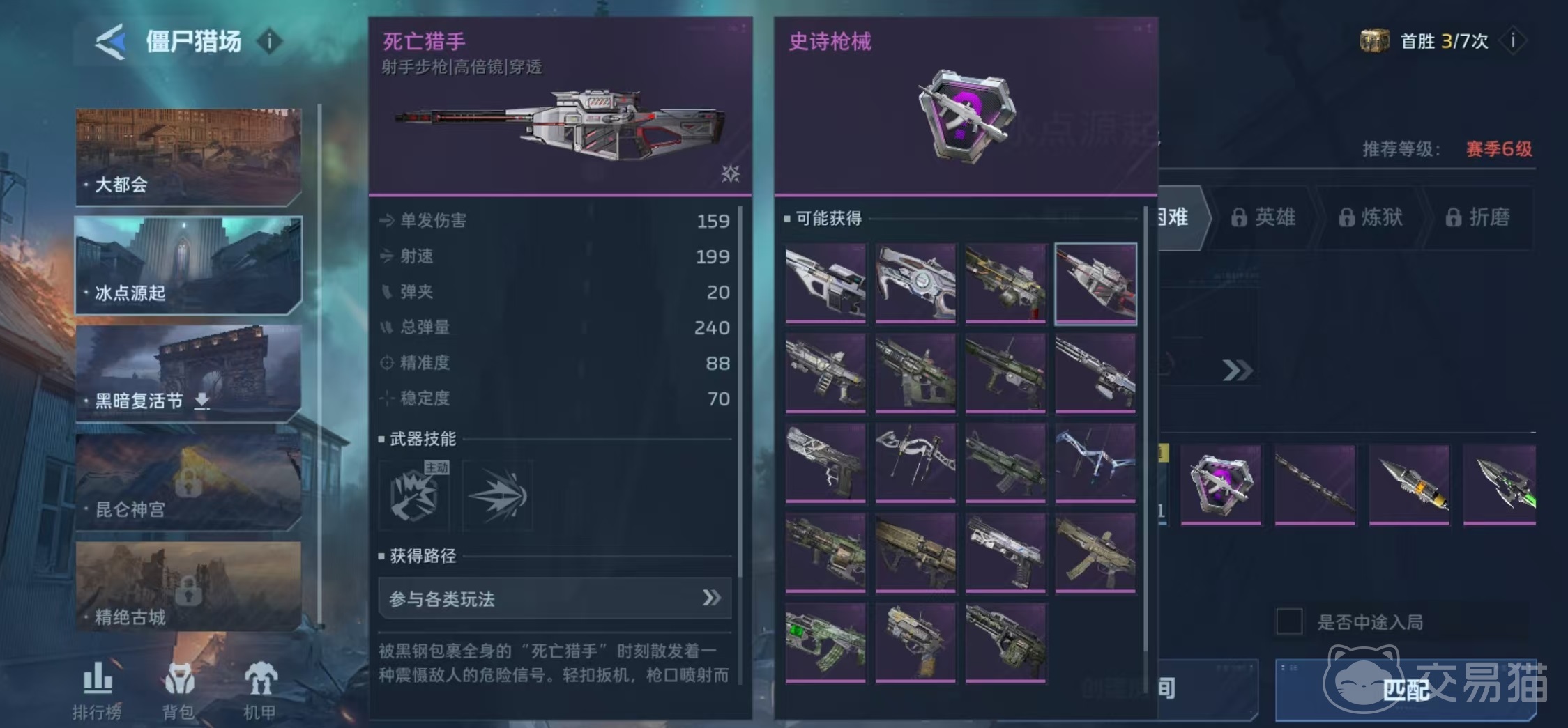 性能方面,死神猎手具备198点单发伤害与199射速,其主动技能“死神之光”可释放一道广域能量波,造成范围伤害,并激活子弹无限穿透效果——该机制使其在多目标交火场景中无需频繁调整瞄准点,即可连续贯穿多个敌人。死亡猎手基础伤害为159,射速同为199,技能“急速狂热”启动后进入无耗弹射击状态,射速提升50%,形成短时火力爆发窗口,更适合中距离拉扯与节奏压制。