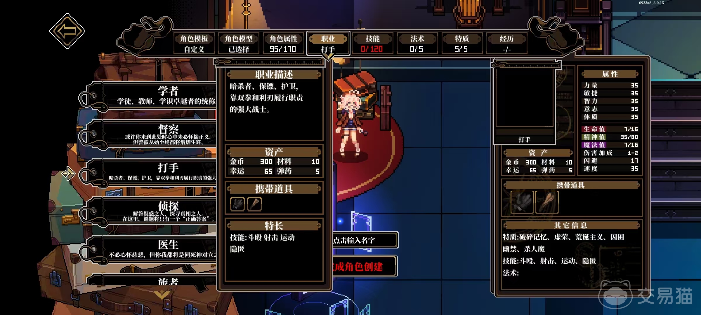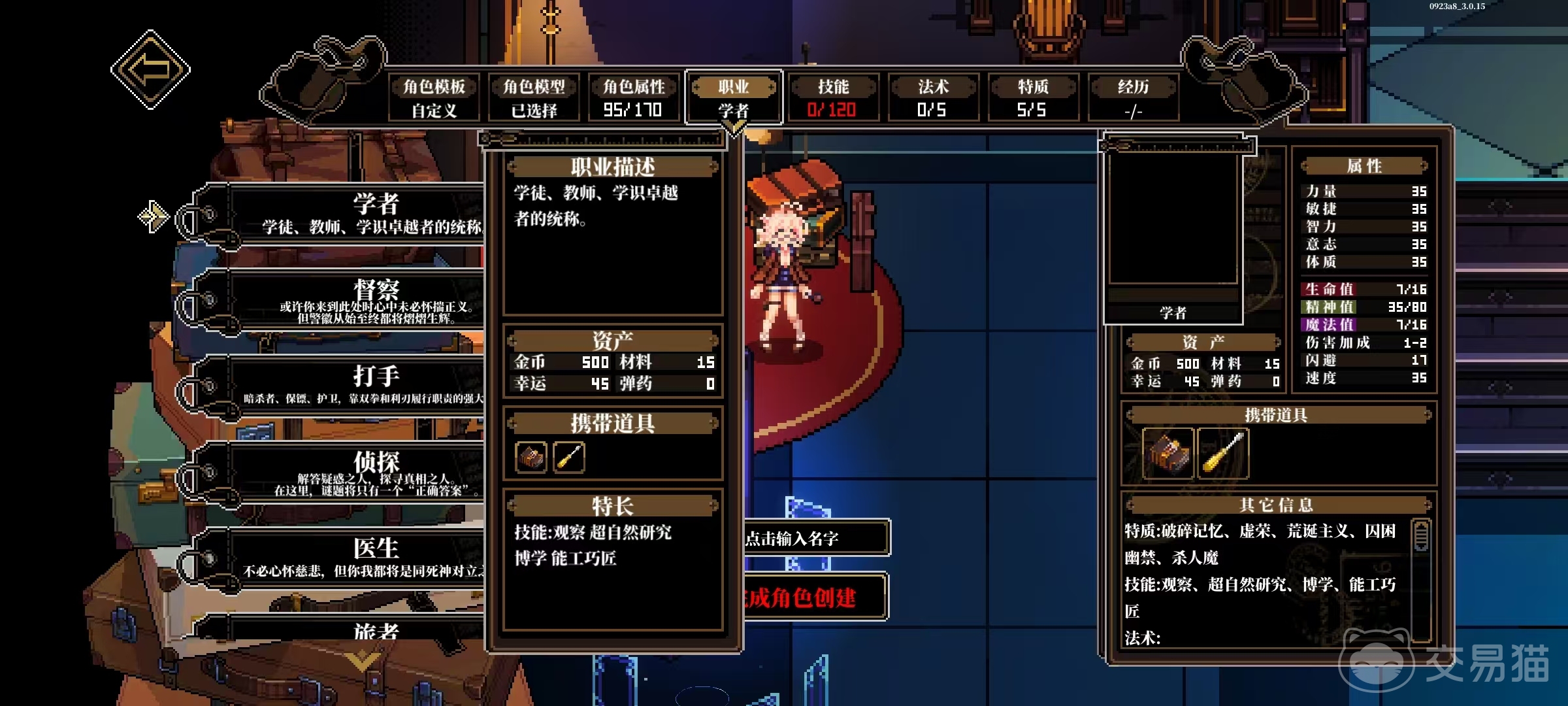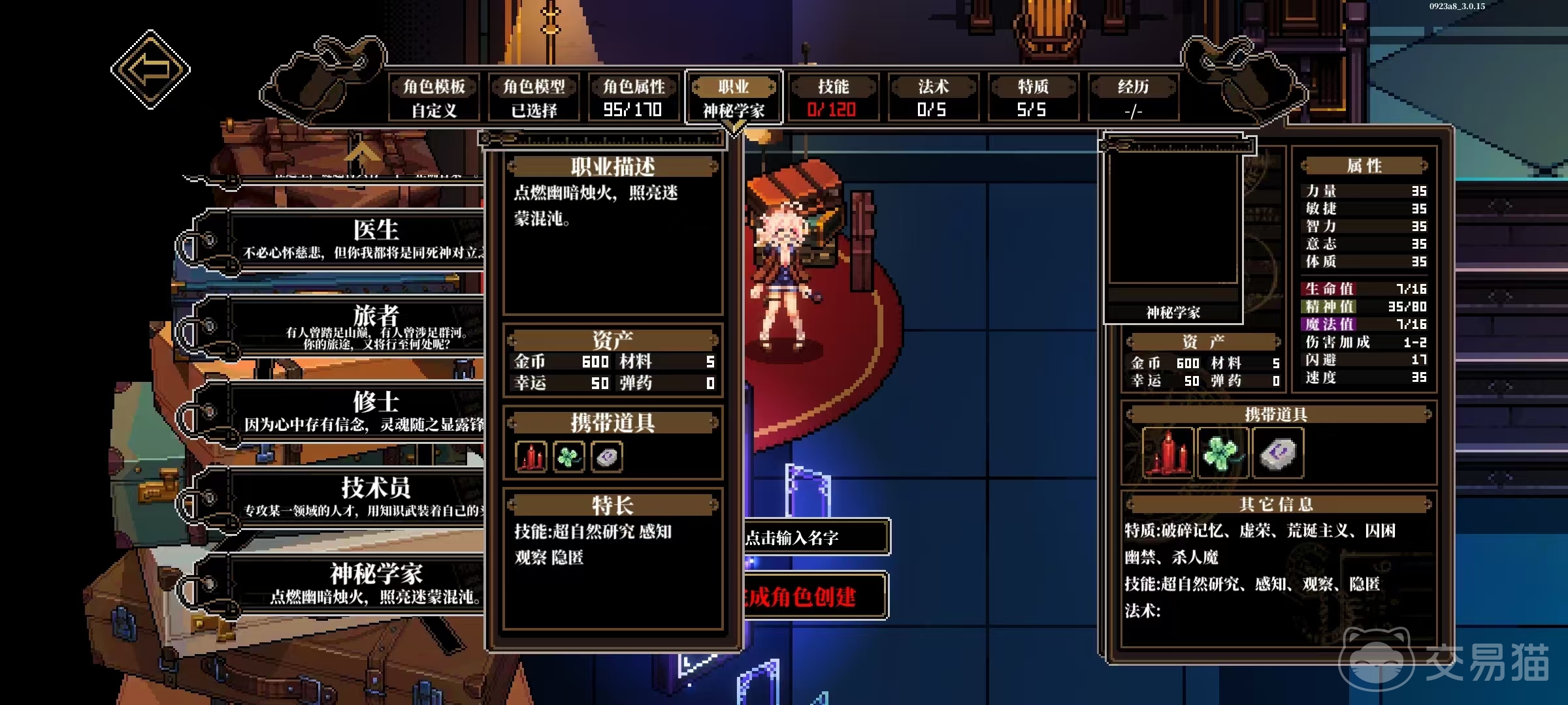 神秘学家以仪式蜡烛(强制绑定不可卸除)、四叶草与魔力符文为专属道具,能力模型围绕超自然研究、灵性感知、微观观察及隐秘行动展开,是解锁深层神话线索与特殊结局的关键职业。九大职业按功能倾向可划分为侦查导向型(如侦探)、知识驱动型(如学者、技术员、神秘学家)、战斗主导型(如打手、督察)及复合支援型(如医生、修士、旅者),每种职业均对应一套差异化五维属性成长曲线,配合独特技能树与道具交互机制,支持玩家构建高度个性化的角色流派。