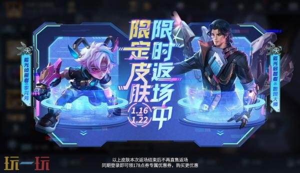 春季赛有礼,活动期间登录游戏即可领取178点券优惠券(返场专属)~可用于购买指定返场皮肤:匿光启智者-鲁班大师、匿光侦查者-李元芳抵扣178点券。