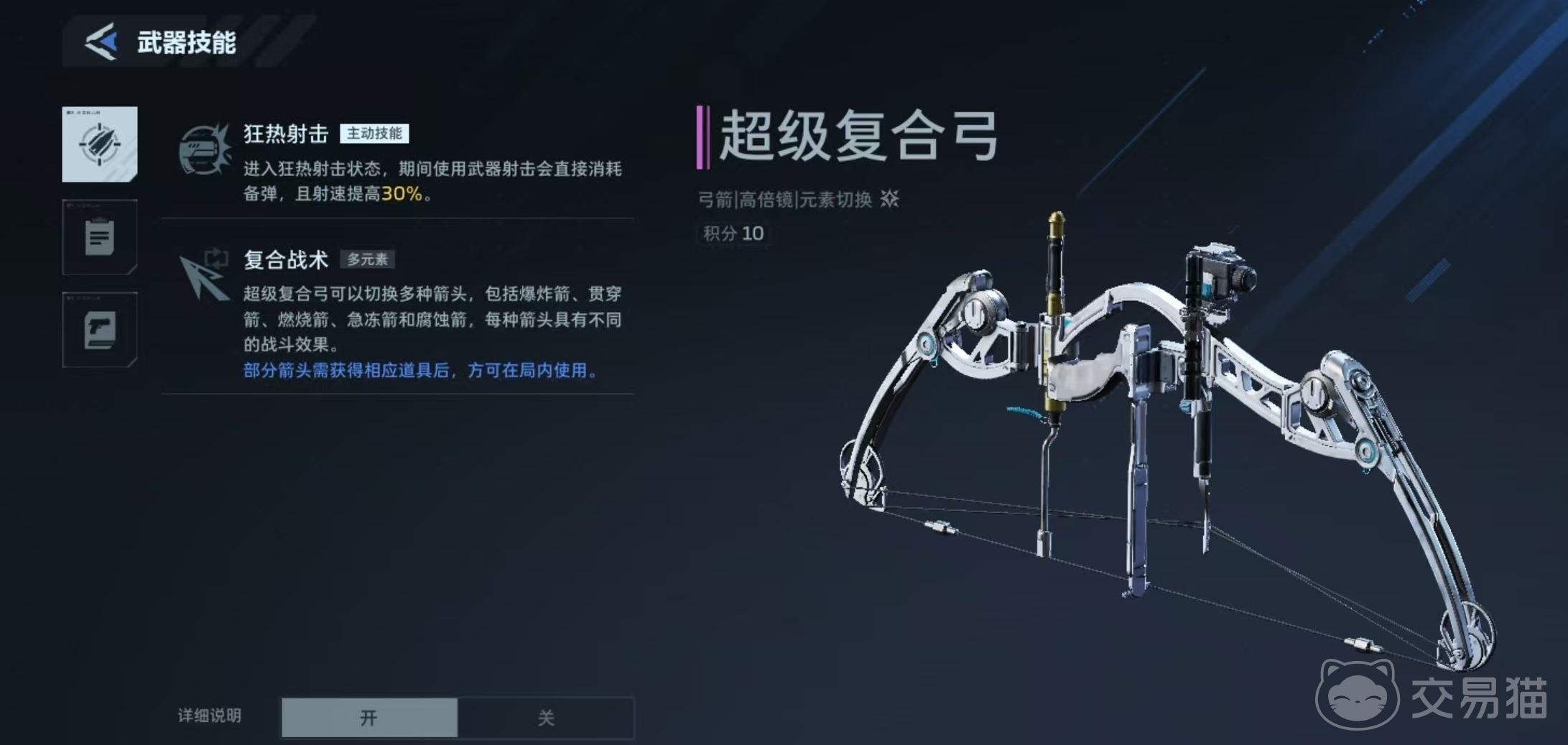 超级复合弓则以模块化战术扩展见长。其主动技能“狂热射击状态”在激活时,射击将直接消耗备弹,并提升30%射速;真正区别于其他弓箭的是其箭头切换系统——支持装配爆炸箭、贯穿箭等多种功能型箭头。爆炸箭适用于密集目标区域清场,贯穿箭可实现多目标穿透打击,不同箭头还可根据主武器类型或地图结构进行动态调整,显著提升应对复杂战局的灵活性与容错率。