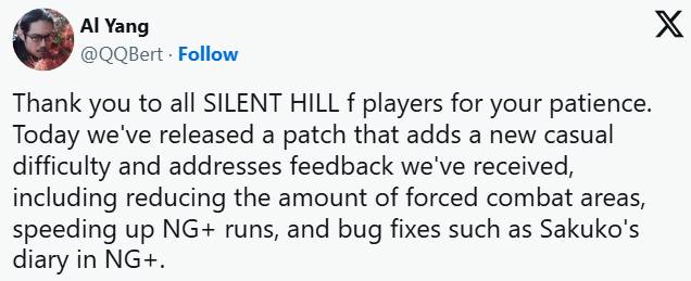 根据《寂静岭f》总监Al Yang的说法,做出此次调整主要是源于玩家反馈——之前不少玩家都认为游戏难度偏高,这次算是对相关声音的合理回应。