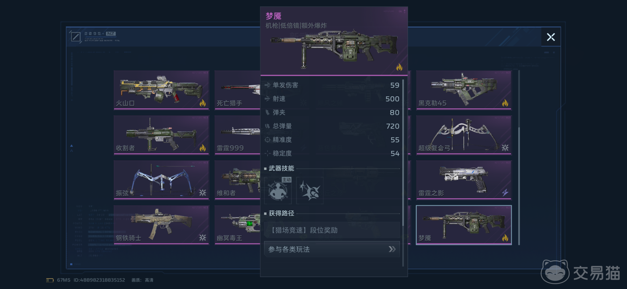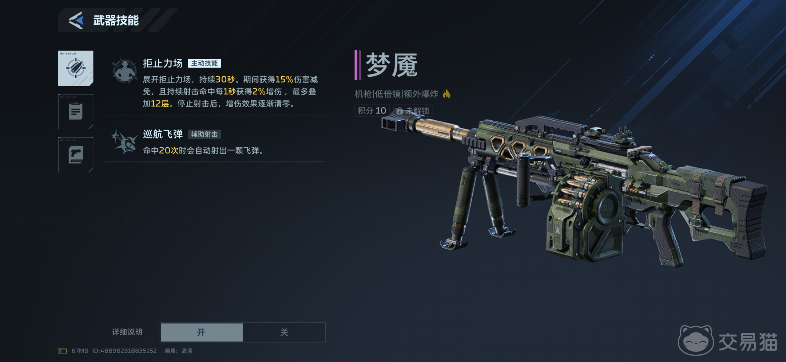 “梦魇”定位为稀有度为史诗的自动机枪,获取路径清晰且门槛友好:玩家可通过蓝色跃迁秘藏直接抽取,概率可观;若未直接获得,亦可在猎场竞速模式中,依据赛季结算段位领取,对段位要求较低。该武器基础属性突出——标准弹匣容量达120发,支持长时间不间断扫射;主动技能具备高额增伤效果,并支持最高12层伤害叠加;被动机制设定为每命中目标20次后,额外触发一枚追踪飞弹,显著强化持续作战中的爆发补充能力。综合来看,“梦魇”在塔防防守、高难度副本攻坚等需要稳定火力覆盖的场景中表现优异。